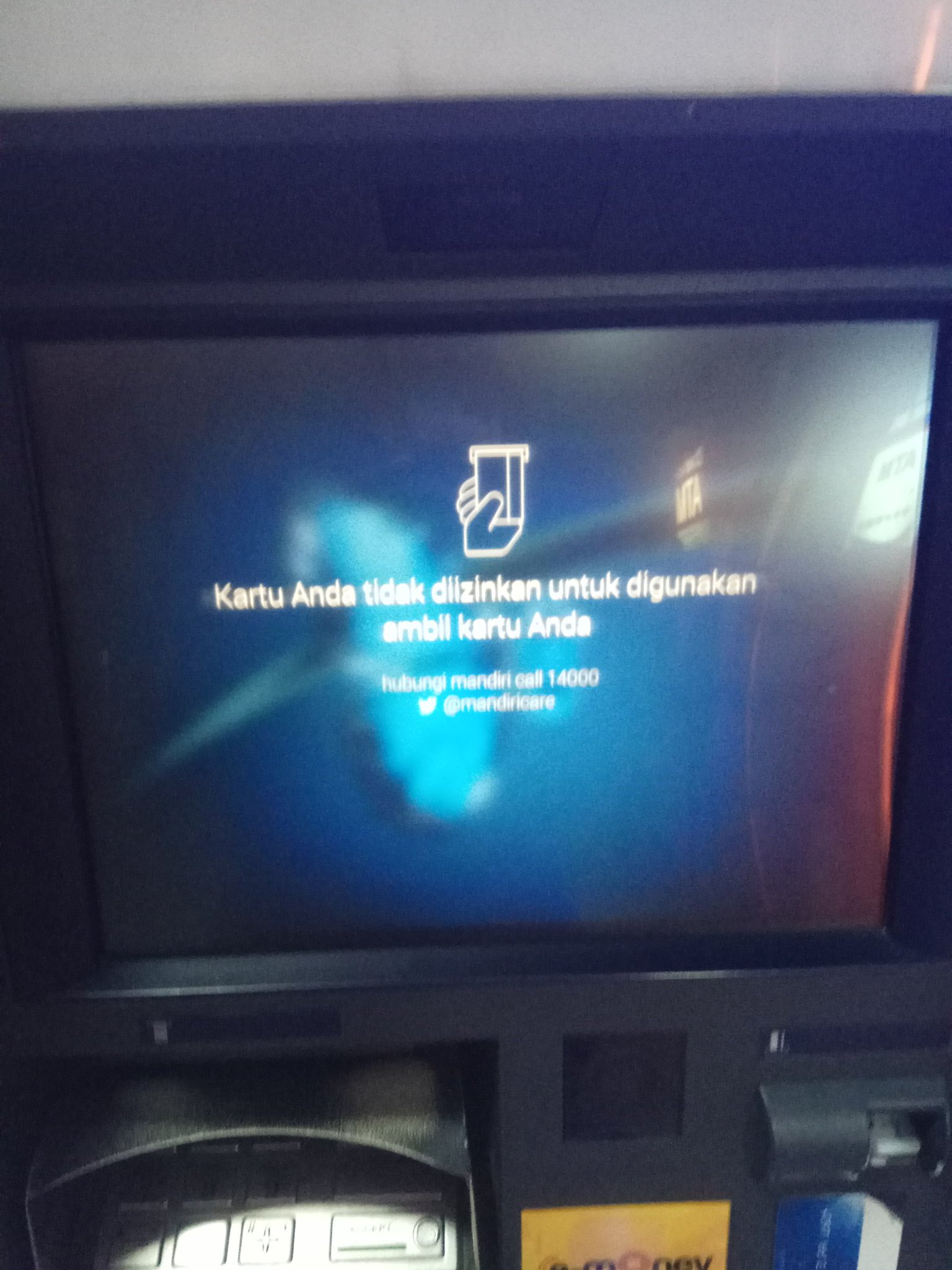 Hari senin lalu,tepatnya 12 mei 2014, saya ingin mengambil uang di atm mandiri dekat rumah saya di bekasi.pada saat yang sama, di beberapa mesin atm yang ada di samping bank mandiri, ada yang tidak bisa digunakan, dan setelah saya menggunakan salah satu mesin atm yang lain, tetapi kartu atm saya keluar lagi, dan ada pesan di layar yang berbunyi:" kartu atm anda tidak diijinkan untuk.